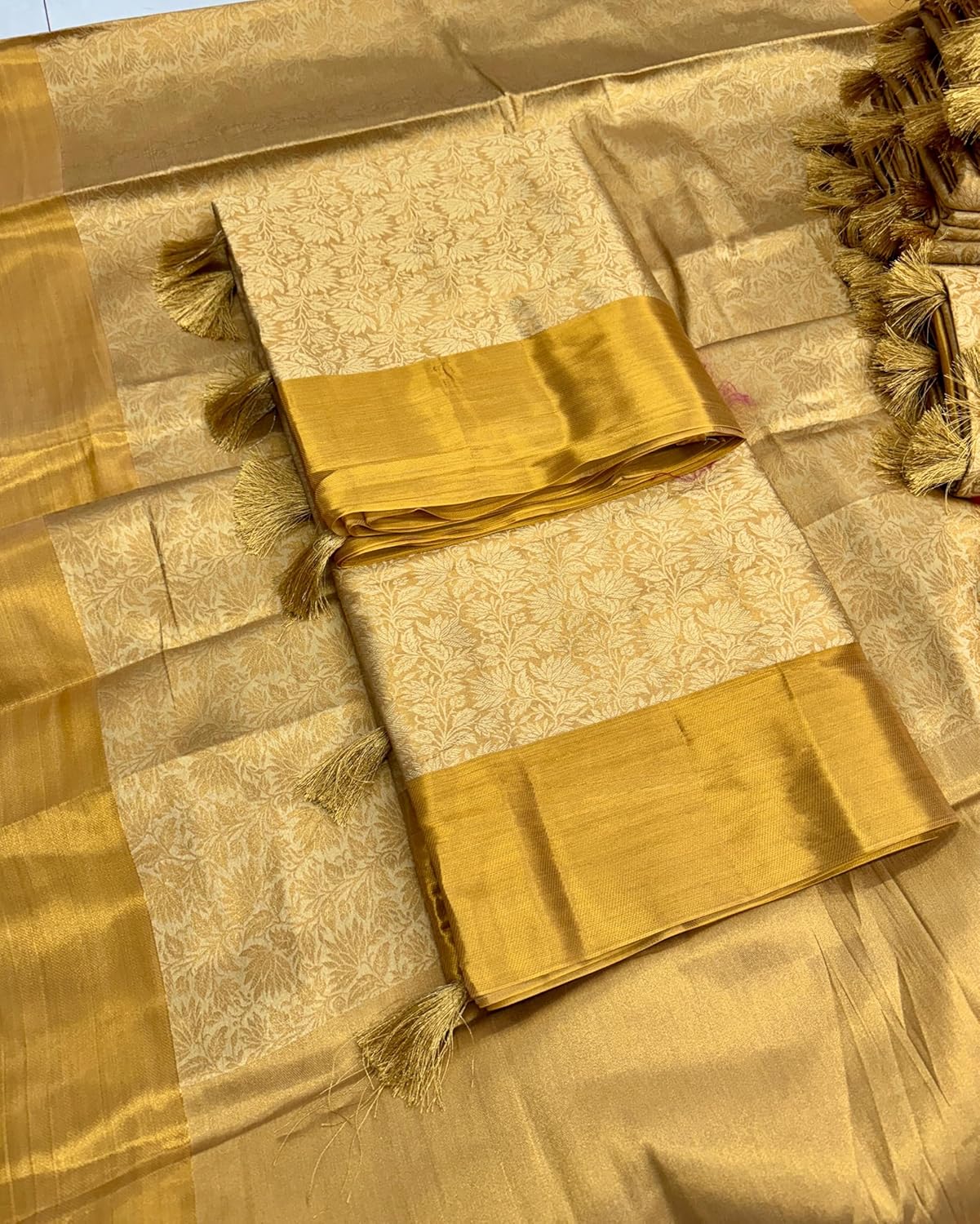 The saree features a rich golden hue with delicate embroidered patterns, adding a touch of opulence.